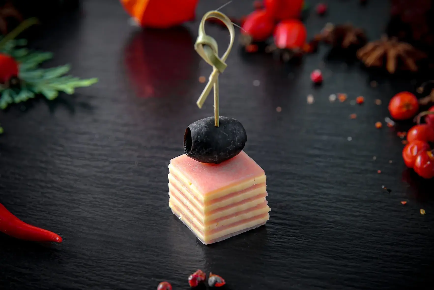 Канапе сырокопченым беконом, сыром Маасдам и маслиной, на ржаном тосте