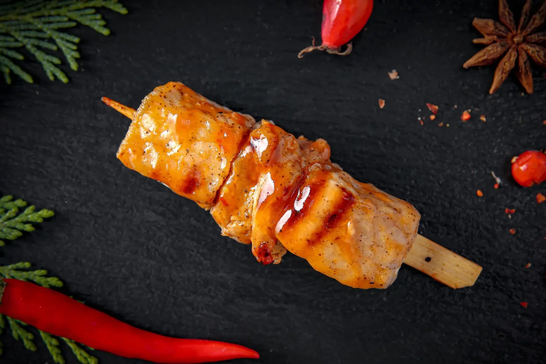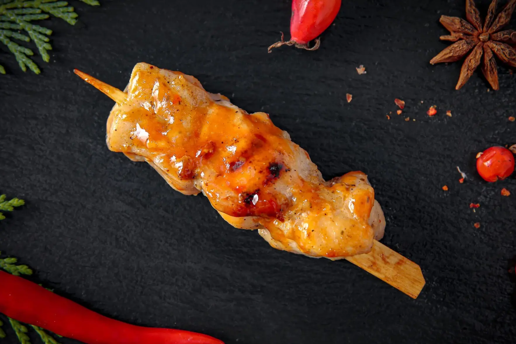 Жареный цыпленок с соусом Sweet chilli, рисом Басмати и розмариновым маслом