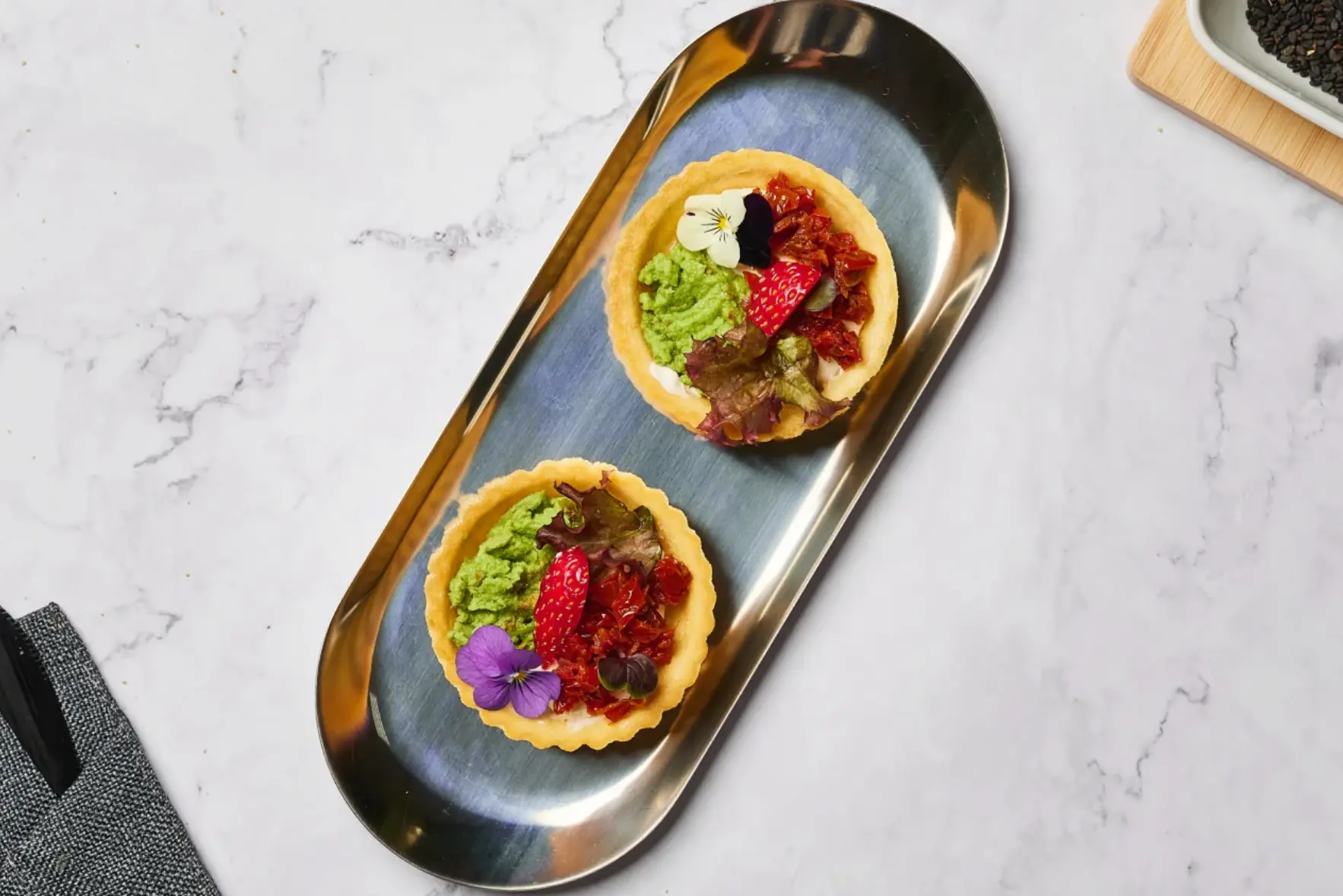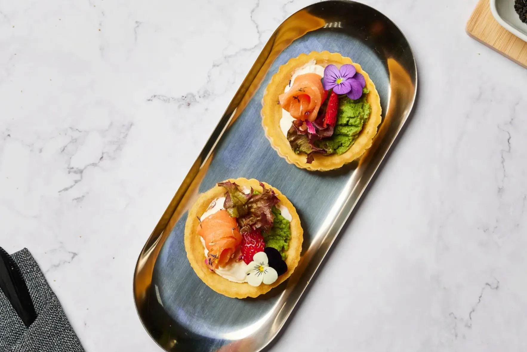 паштет утиный / джем персиковый / огурец / арахис жареный / тарталетка