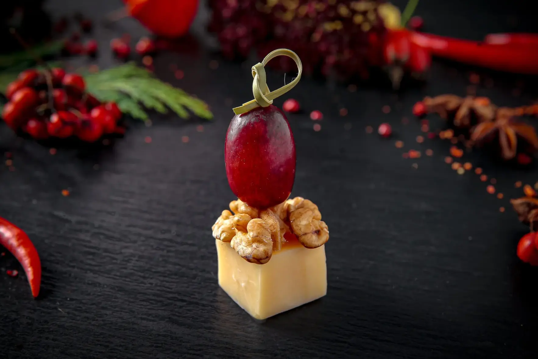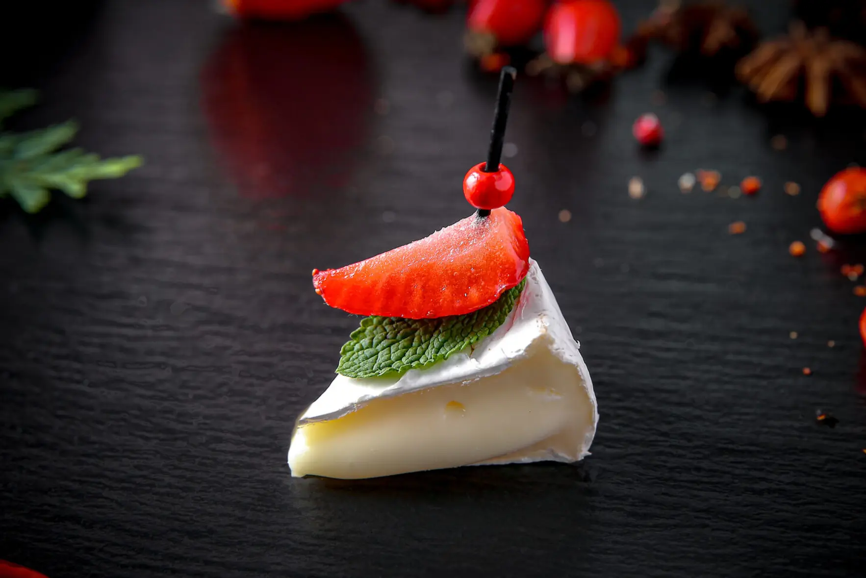 Канапе с сыром Эдам, сезоной ягодой и ягодным джемом