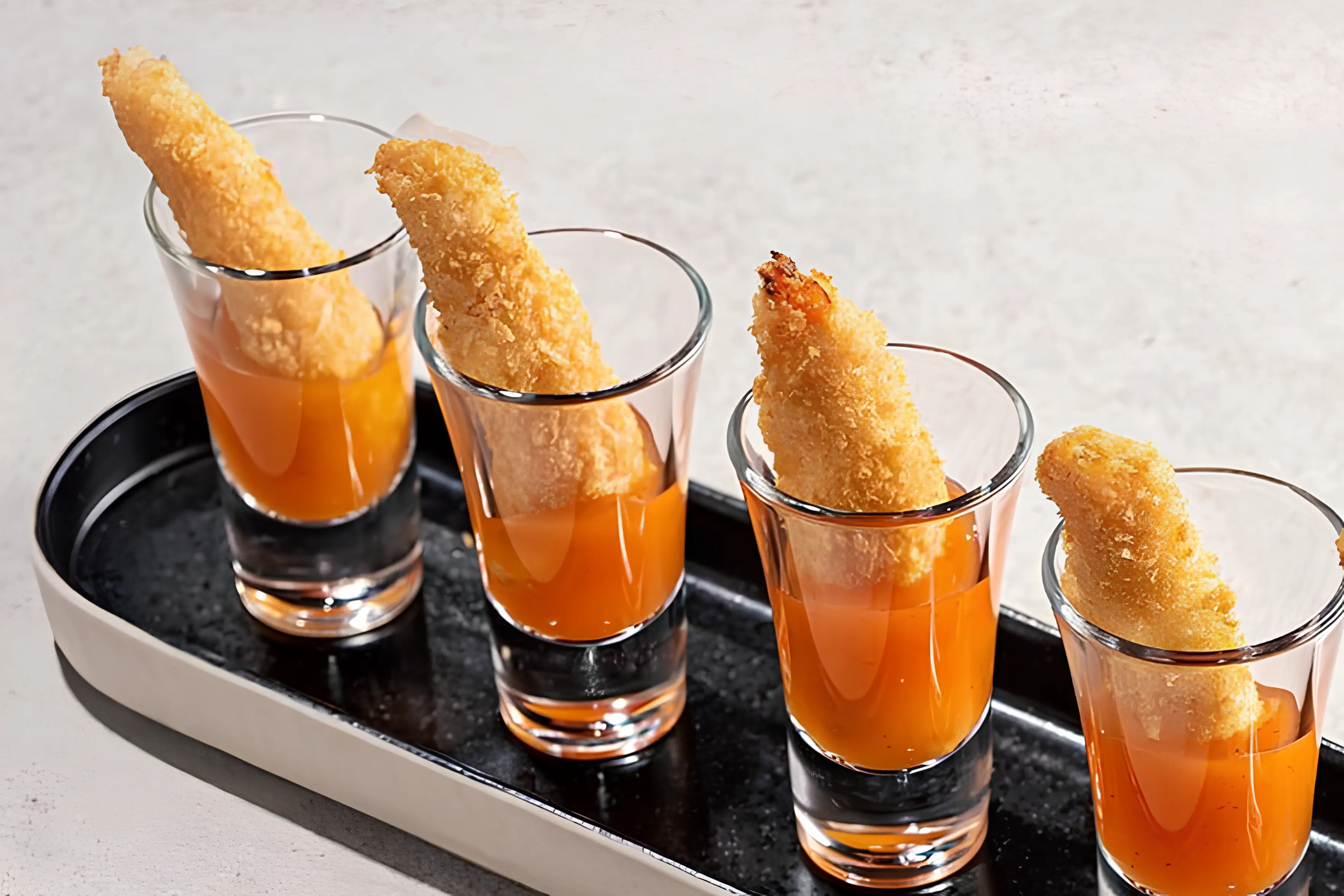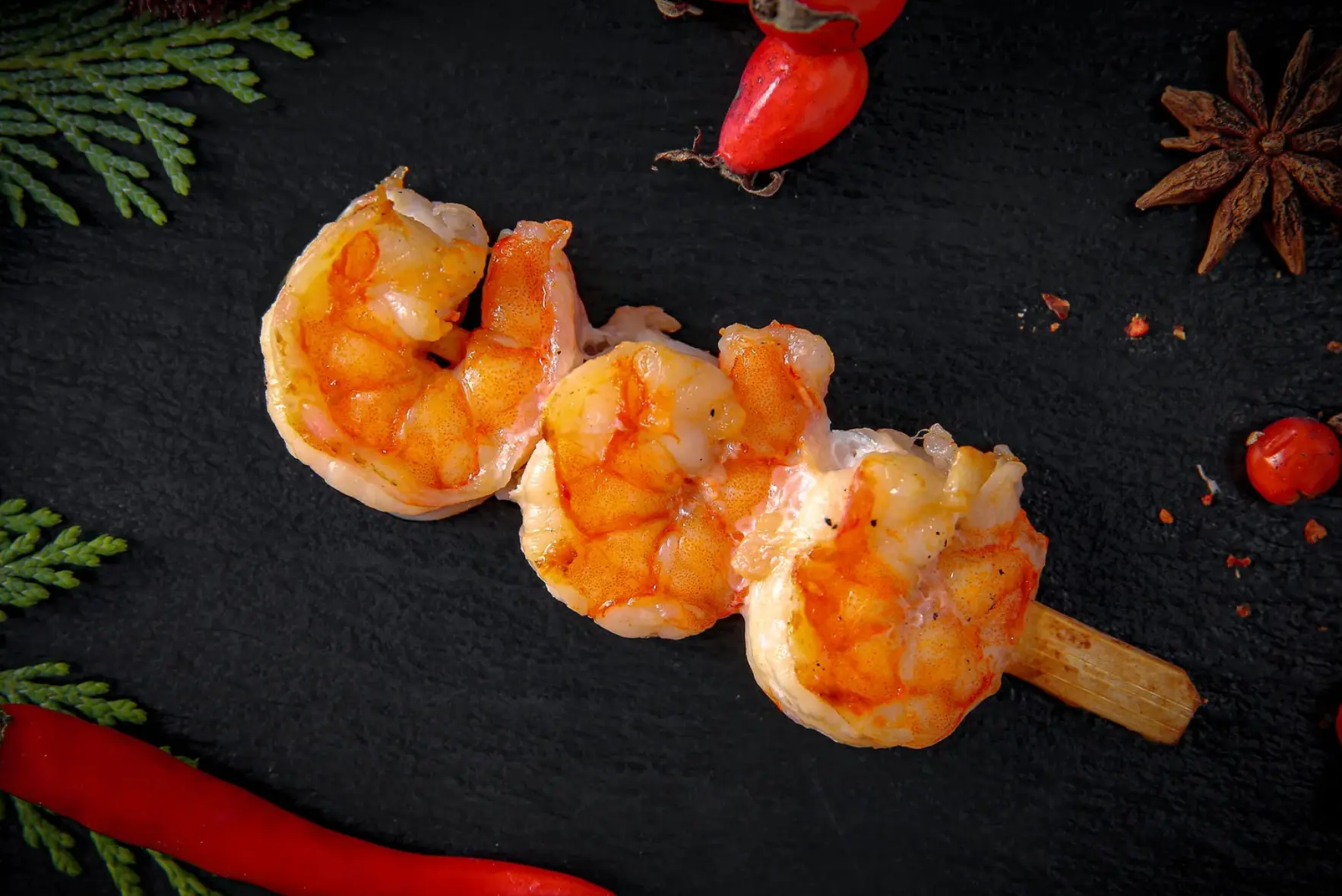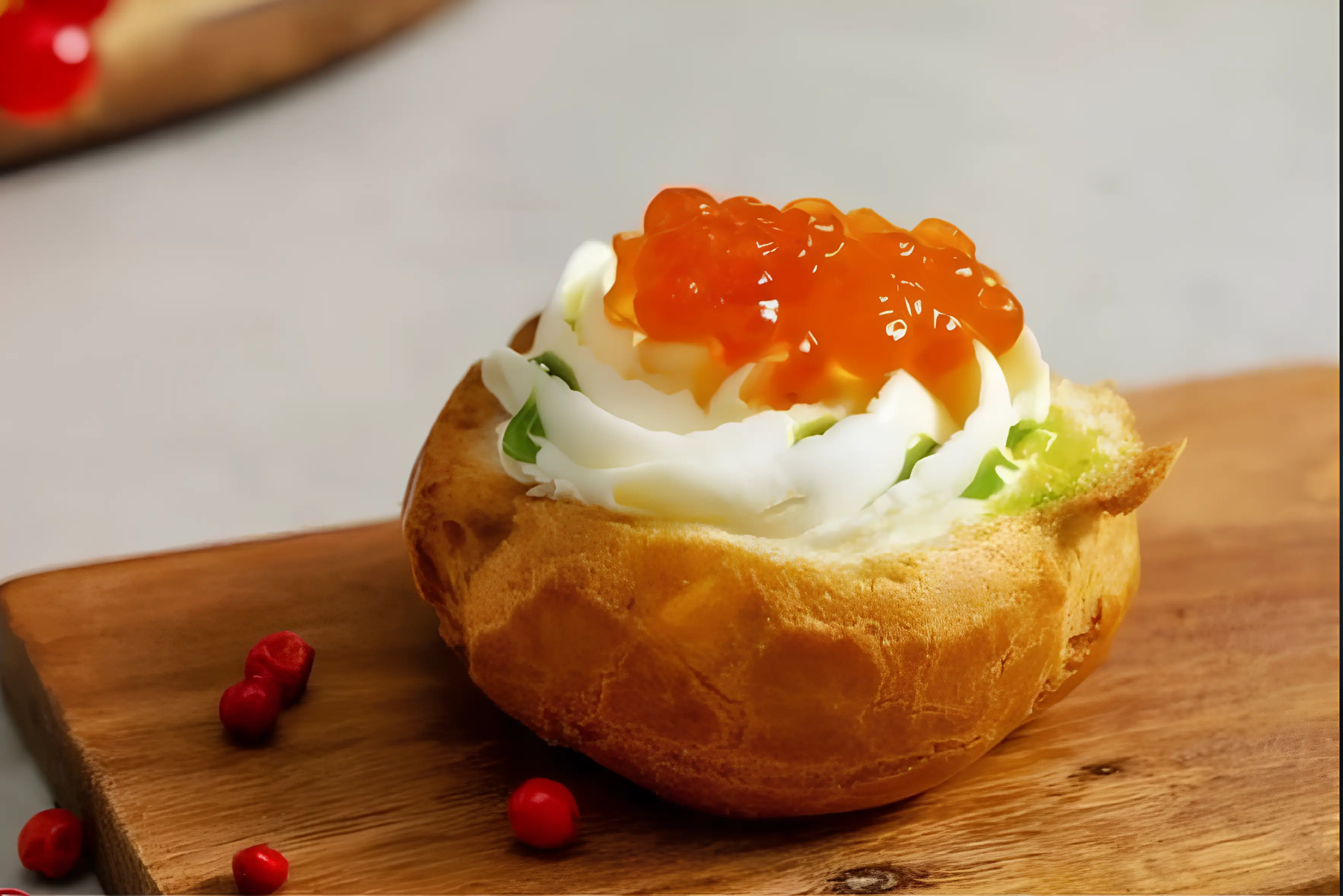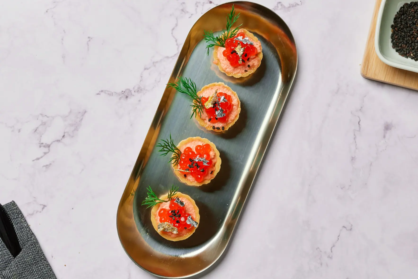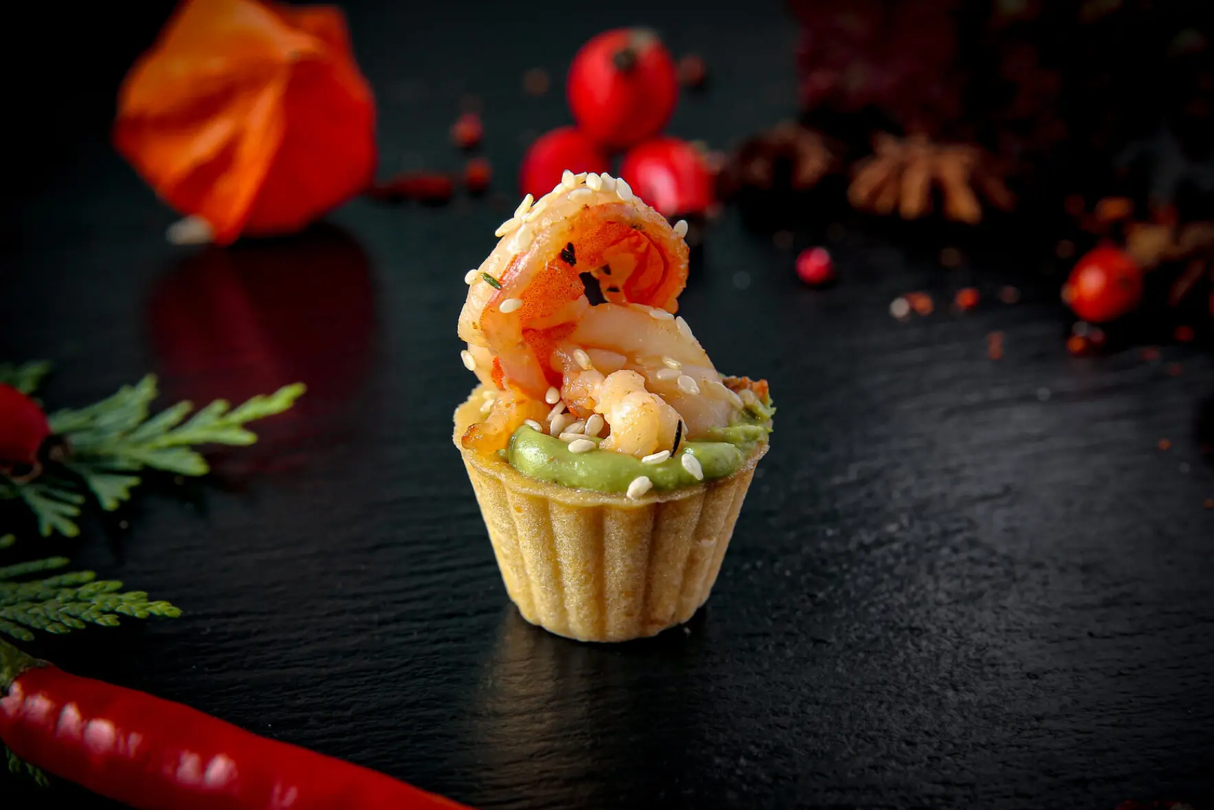 Брускетта с жареной креветкой, красной икрой и кунжутом