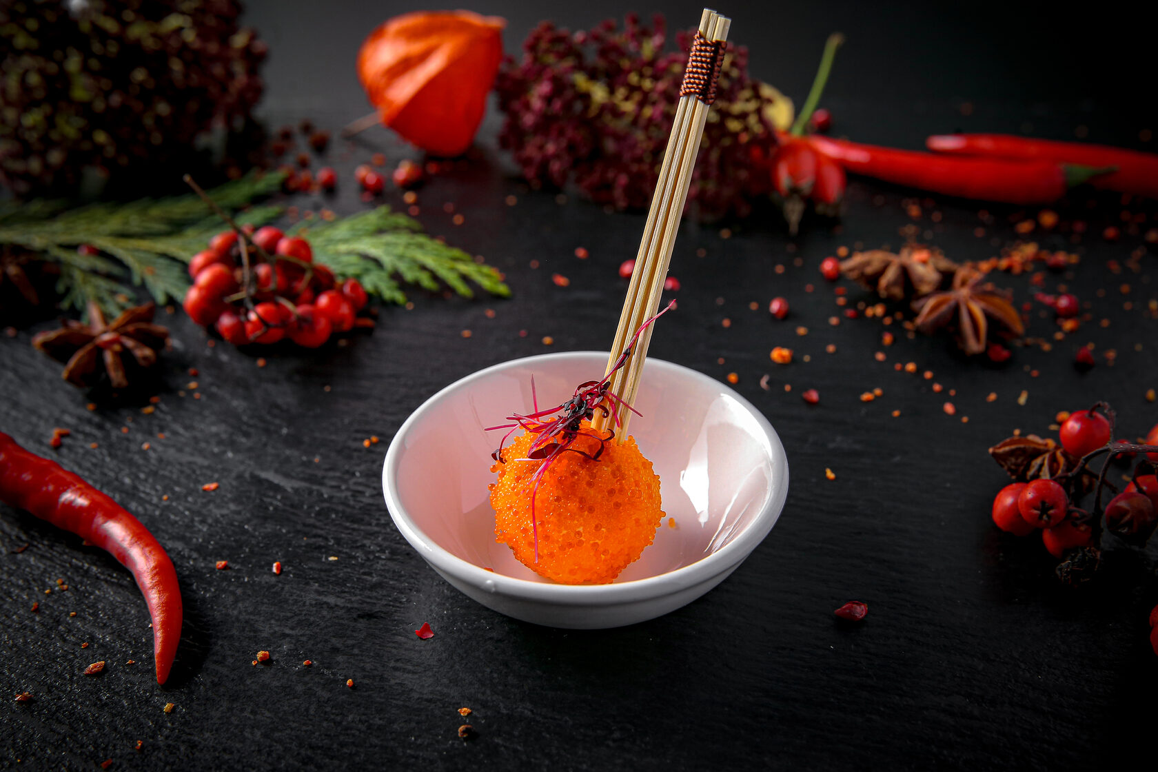 брускетта / крем-чиз / креветка жареная / икра красная / жареный кунжут / микрогрин