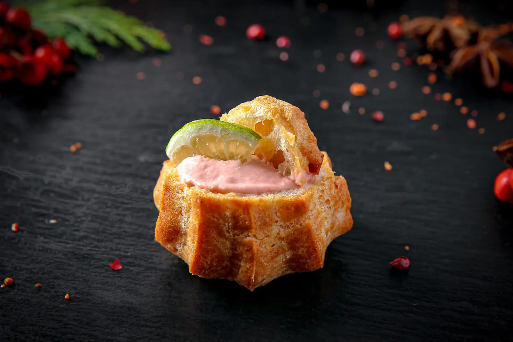 Канапе с утиным паштетом, ягодным джемом, огурцом и арахисом в тарталетке