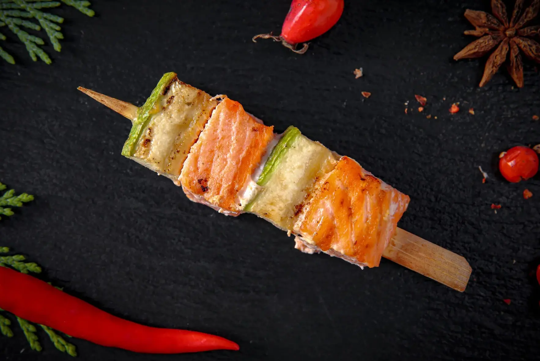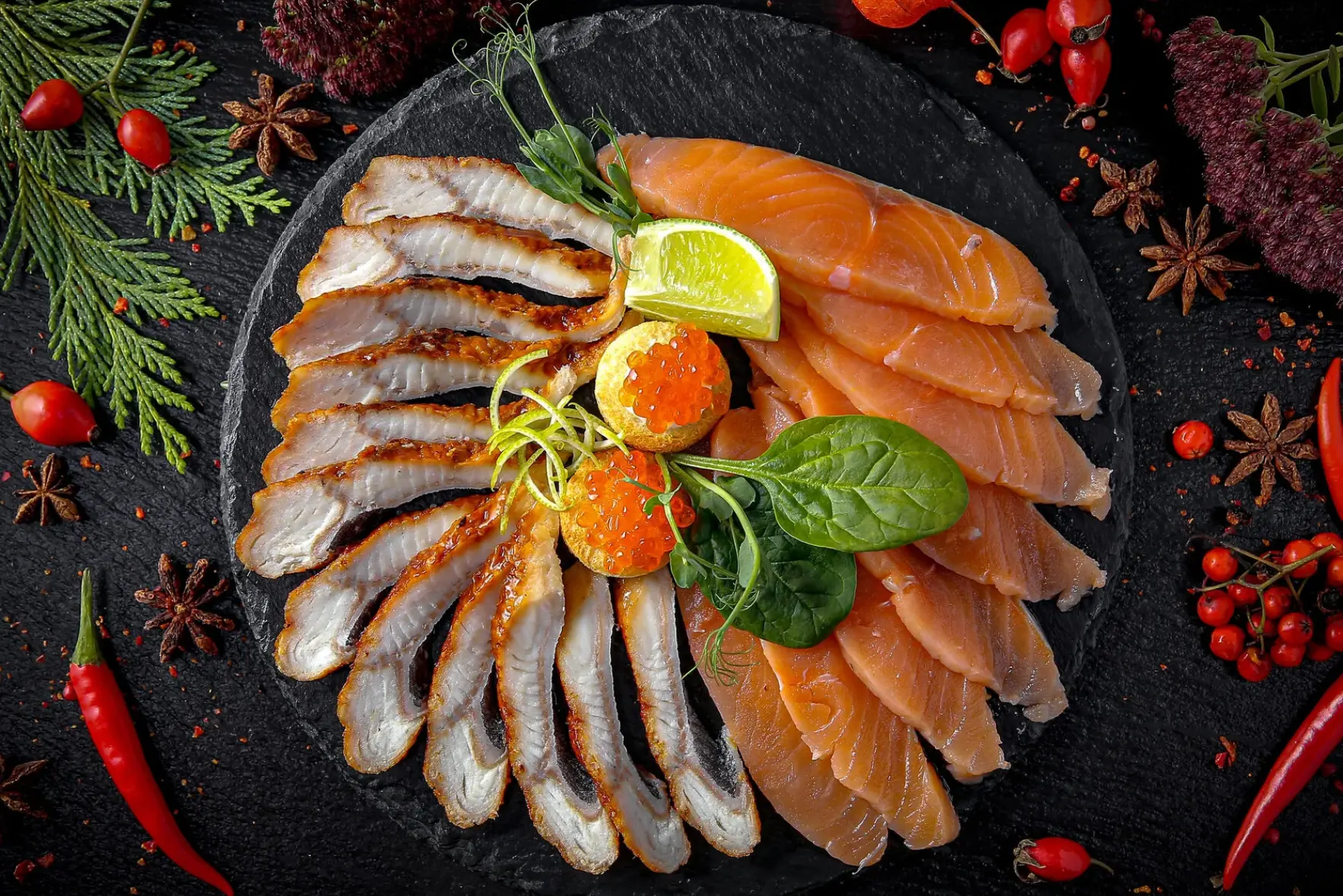 изысканное сочетание лосося, свежего огурца и дольки апельсина.