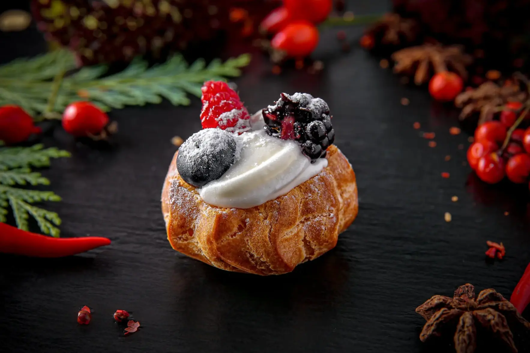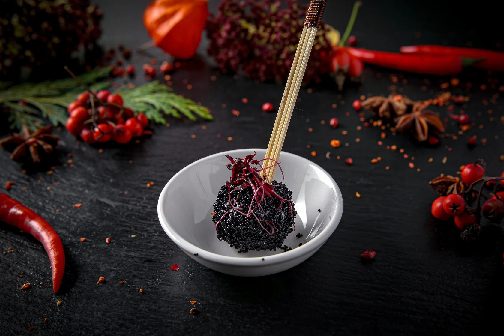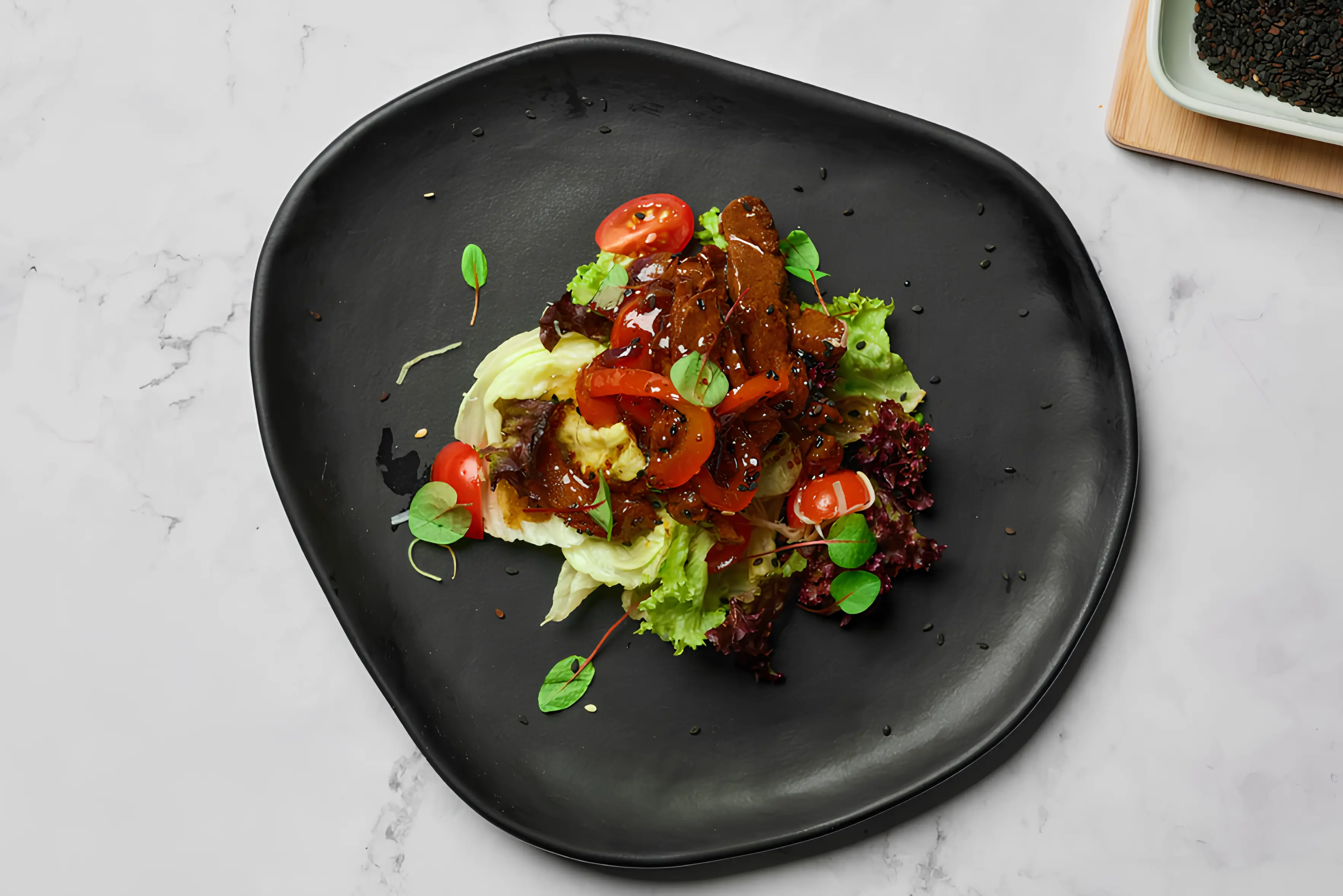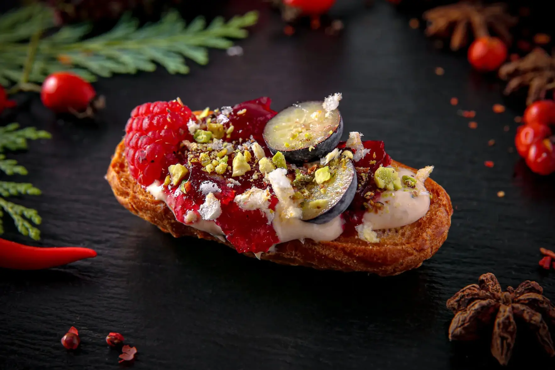 брускетта / крем-чиз / ростбиф / вишневый джем / жареный кунжут / микрогрин