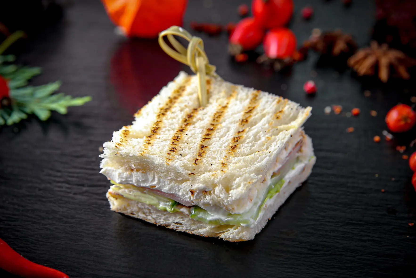 Канапе с куриным рулетом, вяленым томатом и зеленым луком, на ржаном тосте
